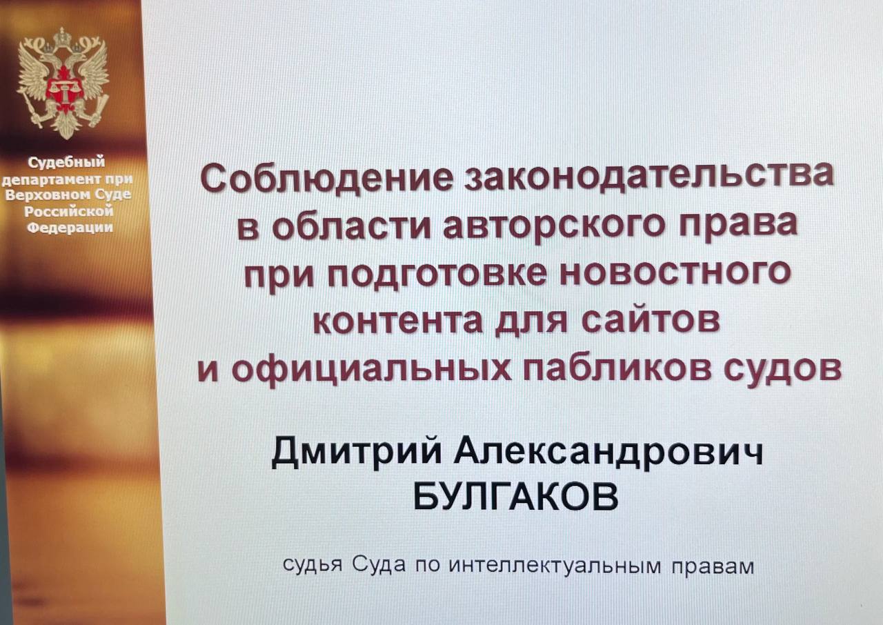 25 апреля 2025 года прошел вебинар на тему «Вопросы соблюдения законодательства в области авторского права при подготовке новостного контента для сайтов и официальных страниц судов и органов Судебного департамента в социальных сетях», организованный Судебным департаментом при Верховном Суде Российской Федерации. От Верховного Суда Республики Ингушетия в онлайн-семинаре приняли участие государственные гражданские служащие, ответственные за взаимодействие с общественностью и СМИ, – помощник председателя суда Элина Целоева и начальник отдела правовой информатизации, обобщения судебной практики и взаимодействия со СМИ Хазыр Яндиев. Открыв работу вебинара, с приветственным словом к слушателям обратился заместитель председателя комиссии Совета судей Российской Федерации по связям с государственными органами, общественными организациями и СМИ, председатель Верховного Суда Республики Адыгея Шумен Б.А. Он отметил актуальность темы семинара: «Сегодня, в эпоху цифровизации, такие ресурсы, как сайты и официальные страницы в социальных сетях становятся важными каналами для информирования общественности о правоприменительной практике и деятельности судов. В связи с этим возникает необходимость тщательного изучения законодательства об авторском праве, чтобы избежать проблем и обеспечить законность действиям пресс-служб судов», – подчеркнул Байзет Азметович. Мастер-класс «Соблюдение законодательства в области авторского права при подготовке новостного контента для сайтов и официальных пабликов судов» в онлайн-режиме провел судья Суда по интеллектуальным правам Булгаков Д.А. Он рассказал об особенностях публикации материалов, созданных с помощью нейросетей, о порядке использования орфанных произведений, а также контента, размещенного на площадках социальных медиа. ![]() ![]() ![]() ![]() Информация пресс-службы Верховного Суда Республики Ингушетия. При использовании ссылка обязательна. |