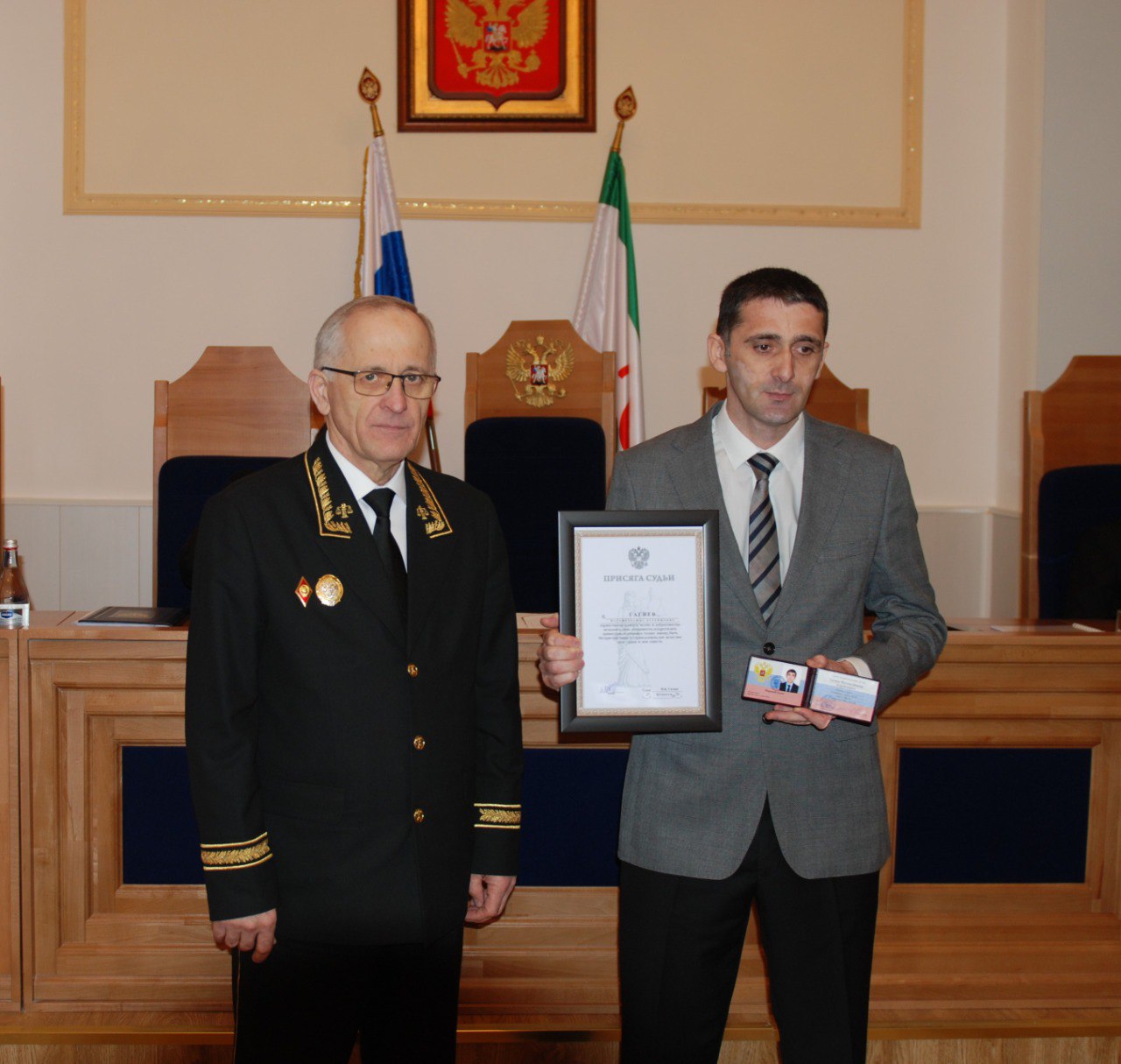 27 февраля 2026 года в актовом зале Верховного Суда Республики Ингушетия в рамках расширенного совещания федеральных и мировых судей судов общей юрисдикции Республики Ингушетия по итогам работы за 2025 год в торжественной обстановке состоялась церемония принесения присяги вновь назначенным мировым судьей Гагиевым Магомедбаширом Курейшовичем. В мероприятии приняли участие судьи судов общей юрисдикции республики и начальник Управления Судебного департамента в Республике Ингушетия Гадаборшев М.М. Открывая мероприятие, председатель Верховного Суда Республики Ингушетия Газдиев И.Б. сказал: «Сегодня для судебной системы республики значимое событие: 29 января 2026 года постановлением Народного Собрания Республики Ингушетия № 2 бывший помощник судьи Верховного Суда Республики Ингушетия Гагиев М.К. назначен на должность мирового судьи судебного участка № 15 Республики Ингушетия». Исса Баматгиреевич от лица всего судейского сообщества региона поздравил вновь назначенного мирового судью с началом нового профессионального пути и пожелал высоко нести честь российской судебной системы. В судебной системе Ингушетии Гагиев М.К. работает с сентября 2015 года. Свою служебную деятельность начал в Верховном Суде Республики Ингушетия с должности секретаря судебного заседания. С сентября 2016 года и до назначения на должность мирового судьи работал помощником судьи Верховного Суда Республики Ингушетия. Согласно Закону РФ «О статусе судей в Российской Федерации» вновь назначенный мировой судья перед Государственным флагом Российской Федерации и Государственным флагом Республики Ингушетия принес присягу: «Торжественно клянусь честно и добросовестно исполнять свои обязанности, осуществлять правосудие, подчиняясь только закону, быть беспристрастным и справедливым, как велят мне долг судьи и моя совесть». Далее председатель Верховного Суда Республики Ингушетия Газдиев И.Б. вручил мировому судье Гагиеву М.К. служебное удостоверение. С напутственным словом к вновь назначенному мировому судье обратился начальник Управления Судебного департамента в Республике Ингушетия Гадаборшев М.М., пожелав успехов в профессиональной деятельности. ![]() ![]() Информация пресс-службы Верховного Суда Республики Ингушетия. При использовании ссылка обязательна. |